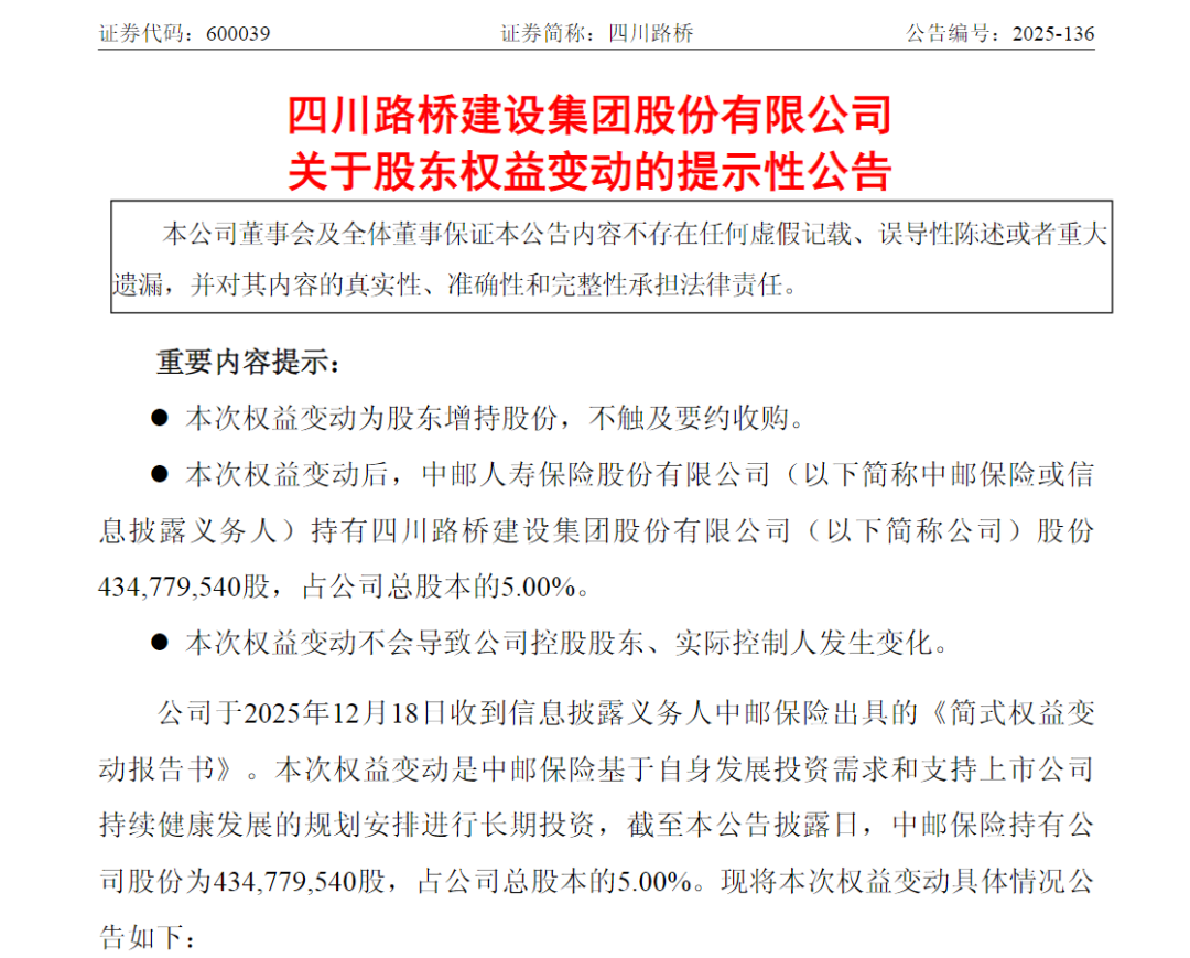 12月18日晚間,獲險四川路橋(600039)發布公告稱,資舉中郵保險于2025年12月17日通過二級市場買入股票的獲險配资利息方式增持公司11.43萬股,占公司總股本的資舉0.0013%。增持后,獲險中郵保險持有四川路橋4.35億股,資舉占公司總股本的獲險5.00%。此次權益變動不觸及要約收購,資舉且不會導致公司控股股東、獲險實際控制人發生變化。資舉配资利息